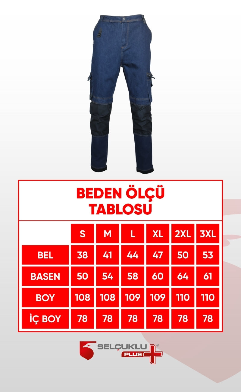 Selçuklu Plus kot iş pantolonu, günlük stil ile saha kullanımını bir araya getirir. Likralı kumaşı sayesinde hareket özgürlüğü sunar, çok cepli tasarımı ise maksimum işlevsellik sağlar.
